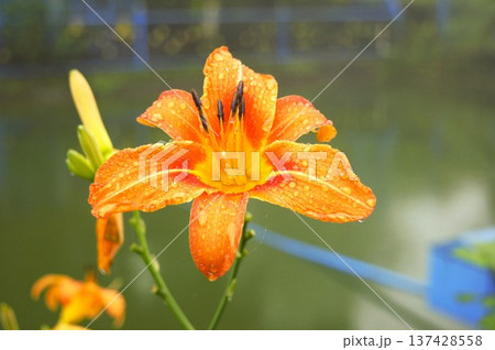 雨に濡れるオレンジ色のユリの花(ネパール)