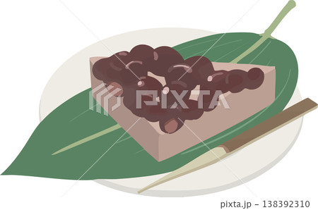 6月の夏越の祓の時に食べる暑気払いの和菓子、皿に盛られた小豆たっぷりの水無月(白)のイラスト