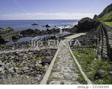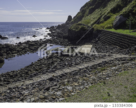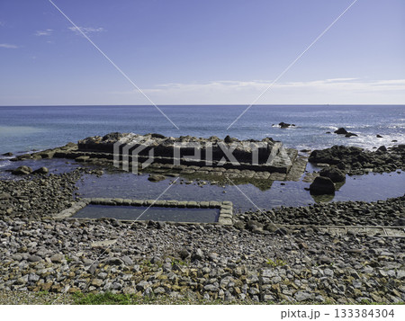 春の北海道函館市恵山岬で水無海浜温泉の風景を撮影