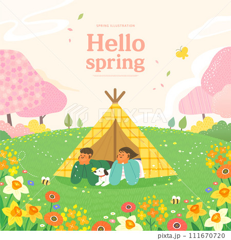 櫻花下作畫的羊與狗狗插畫|春日野餐與藝術時光|お絵描きするヒツジと犬の春イラスト