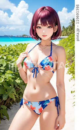 ビーチで遊ぶ水着のビキニ女性 夏風景