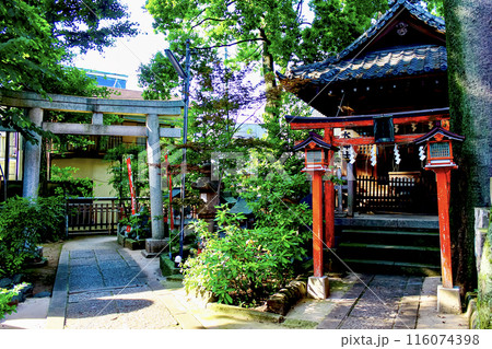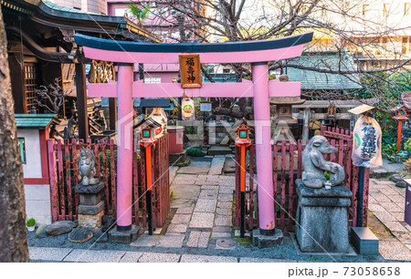 日本の東京都市景観 東京・秋葉原の柳森神社(通称=倉稲魂大社)。狐や狸…、摂社・末社…=神田須田町