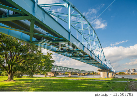 淀川河川公園長柄地区を通る水管橋と阪急千里線の鉄橋 大阪市