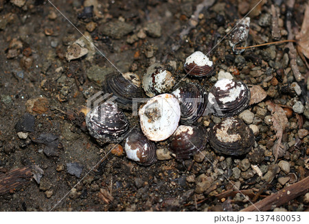 蛍池に堆積した砂泥土の中に埋まっていた多数の淡水性二枚貝マシジミとタイワンシジミの貝殻
