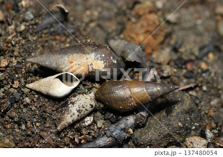 蛍池に堆積した砂泥土の中に埋まっていた多数の淡水性巻貝カワニナ類の貝殻(自然環境下マクロ撮影)