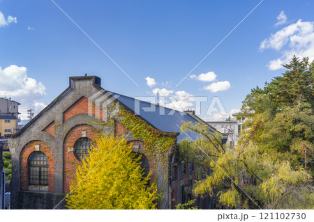 秋の京都 黄葉したイチョウの木と第2期蹴上発電所