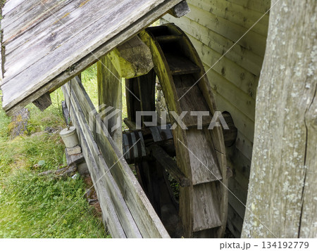 Ancient Watermill in dolomites mountains detail of wooden wheel