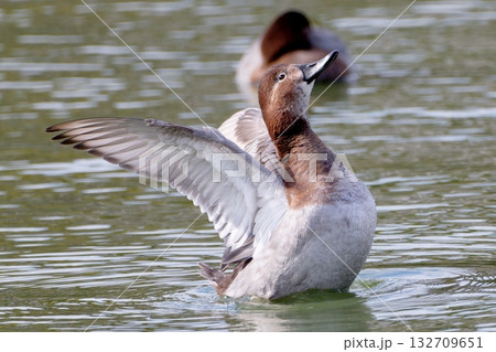 冬に日本で見られる珍しい美しい渡り鳥のカモ、絶滅危惧種のアカハジロ