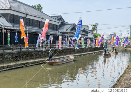 栃木県栃木市 「蔵の街」周辺の巴波川を進む遊覧船と沢山の鯉のぼり