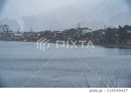 湖北の滋賀県高島市マキノ町海津浜の雪降る古い集落を撮影