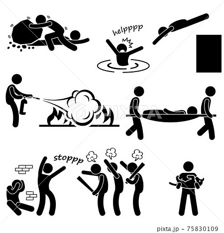 Man Helping Saving Life Rescue Savior Stick Figure Pictogram Icon. A set of stick figure pictograms representing man saving and rescuing human life.