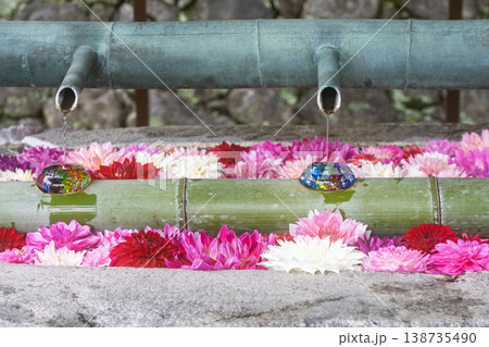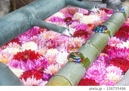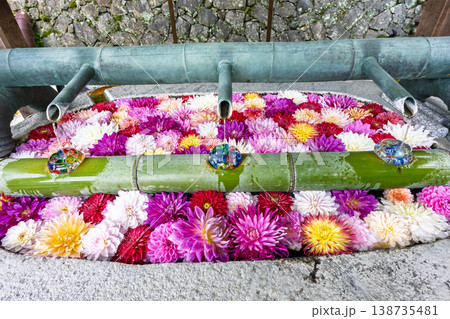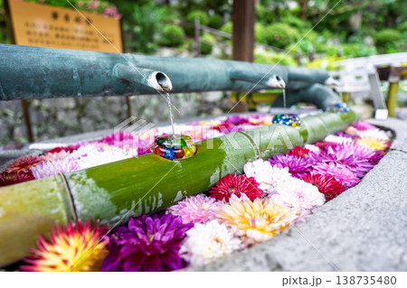 奈良県明日香村にある西国七番札所岡寺の綺麗な花手水を撮影したもの