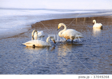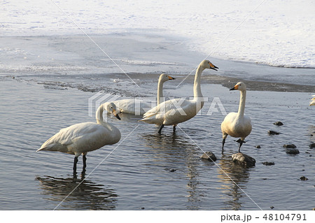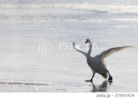 白鳥 氷の上のサーファー オオハクチョウ 写真素材 3月 【撮影地:北海道天塩町】