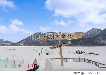 北海道鹿追町 雪と氷の世界の冬の然別湖コタンを散策する観光客