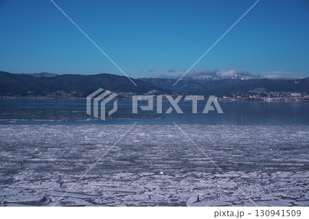 厳冬の諏訪湖 岡谷湖畔公園 みなとなぎさパークから結氷した諏訪湖を望む