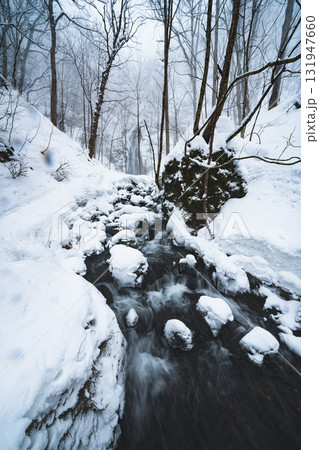 雪に覆われた冬の森と渓流の風景