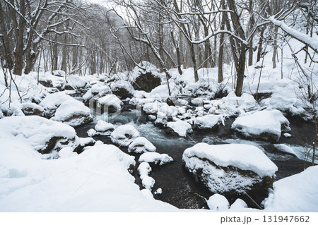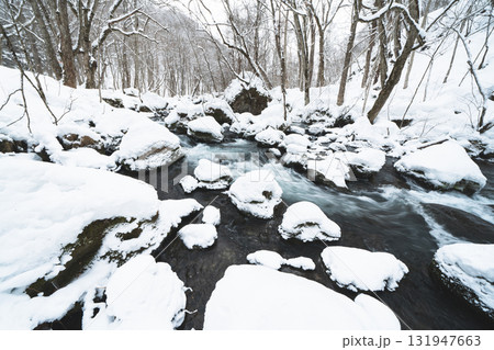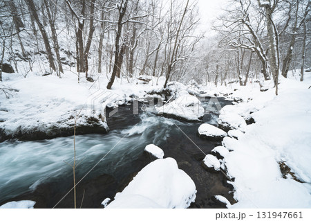 雪に包まれた冬の渓流と静かな森