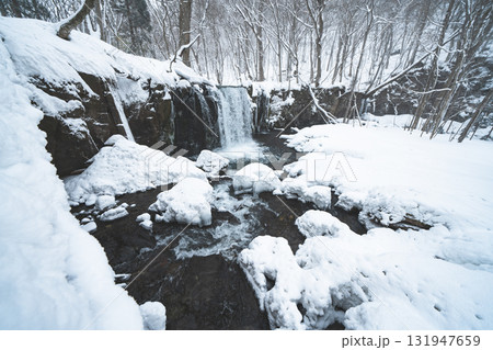 雪に包まれた冬の滝と静寂の森