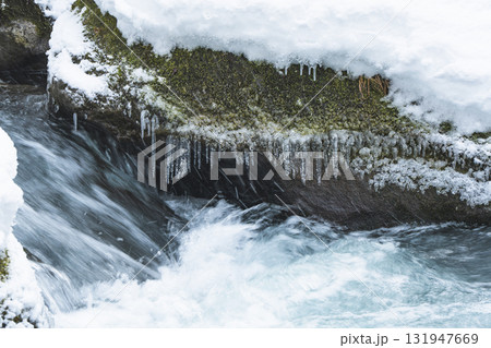 氷柱が並ぶ雪の渓流と流れる水