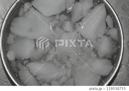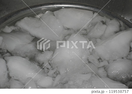 シンクの中のステンレスボールに入っている白濁した氷