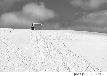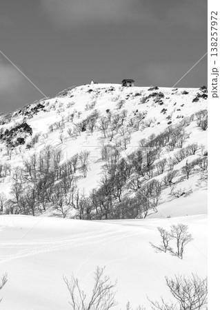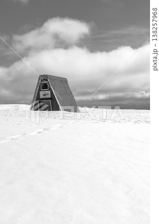 兵庫県最高峰の氷ノ山雪山登山 山頂の三角屋根の避難小屋 新聞、雑誌用