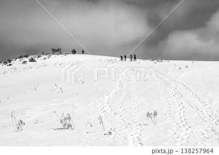 兵庫県最高峰の氷ノ山雪山登山 雪原から氷ノ山の山頂を見上げる 新聞、雑誌用