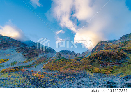 【紅葉素材】秋の紅葉が見ごろになった雲がわく涸沢カールの風景【長野県】
