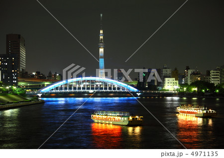 隅田川の屋形船とライトアップのスカイツリーと永代橋