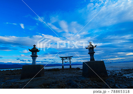 日没後の冬の永尾剱神社の鳥居 干潮時 熊本県宇城市
