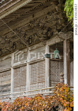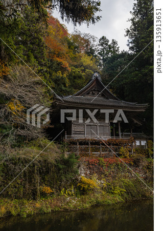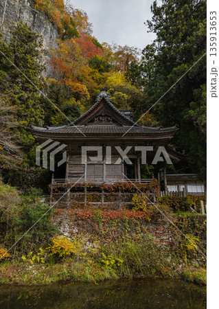 日本 広島県庄原市東城町にある帝釈峡 上帝釈にある石雲山永明寺と紅葉した木々