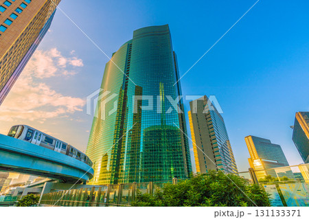 日本の東京都市景観 6月19日。汐留のビジネス街やゆりかもめなどを望む