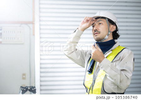 作業着姿で水分補給する作業員の男性 熱中症予防もご安全に