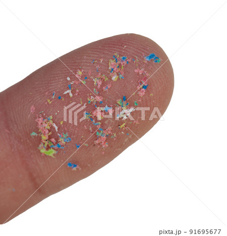 Macro close-up of a microplastic on the finger of the hand. Isolated on white background