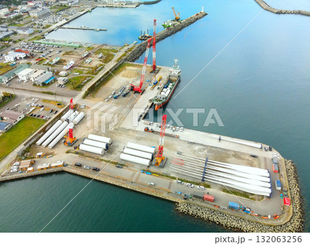 秋の北海道江差町で風力発電風車搬出基地の風景を空撮