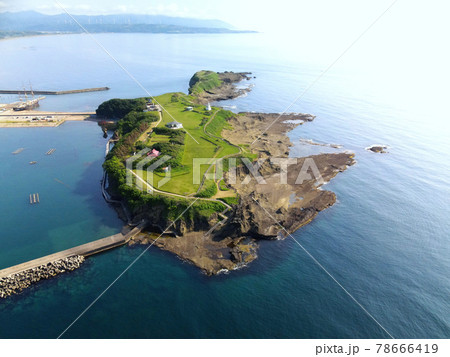 初夏の北海道江差町カモメ島の風景を空撮