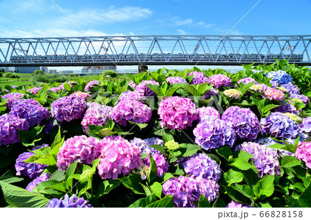 小岩菖蒲園の紫陽花と鉄橋を通過中のスカイライナー