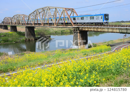 菜の花咲く江戸川サイクリングロードと東武80000系電車