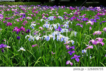 堀切菖蒲園のカラフルな花菖蒲と青空