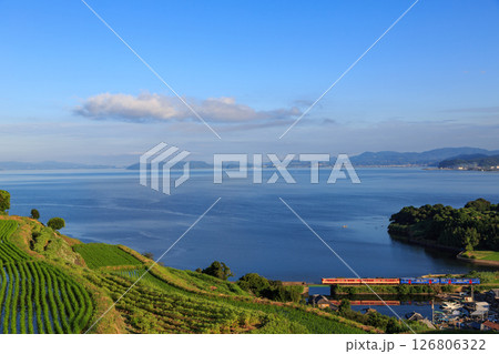 大村湾と棚田のなかで大村線の気動車を遠望する