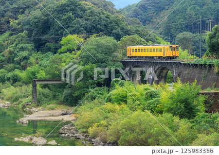 四万十川に沿って予土線の黄色い気動車が西ヶ方のめがね橋を渡る