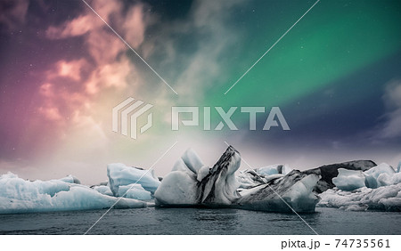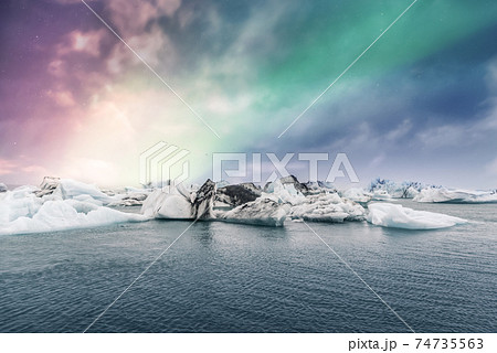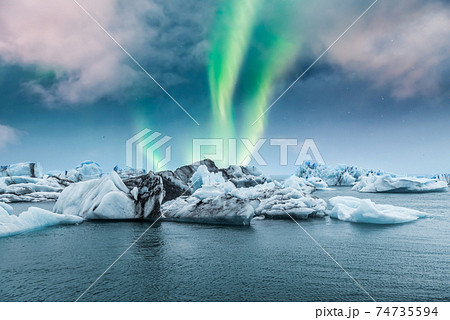 Northern lights aurora borealis over Jokulsarlon glacier ice lagoon in Iceland