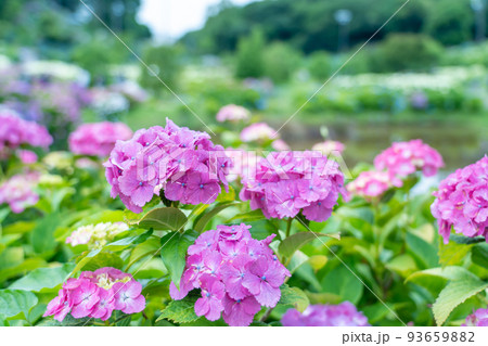 三重県津市 赤紫色の紫陽花が咲くかざはやの里の池の周り
