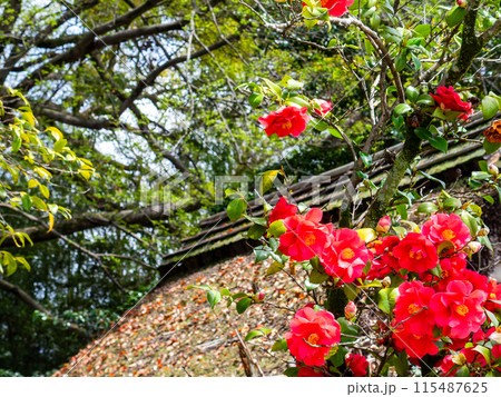 春の岡山 後楽園の趣深い景色 満開の真っ赤なツバキと茅葺屋根