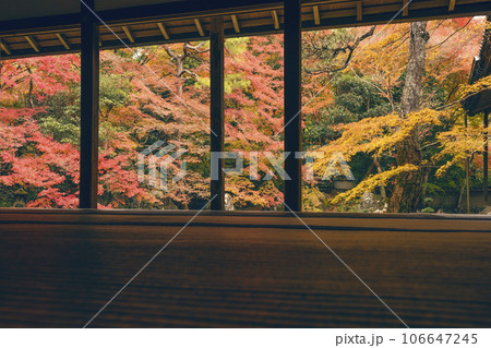 蓮華寺の紅葉の風景 和室から眺める紅葉 京都の紅葉の名所 日本庭園とモミジ 秋の京都観光スポット