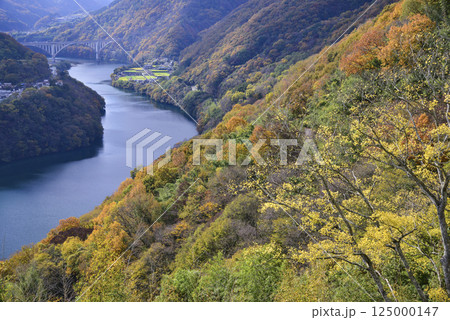池田ダム湖に映える池田へそっこ大橋と山を染める紅葉