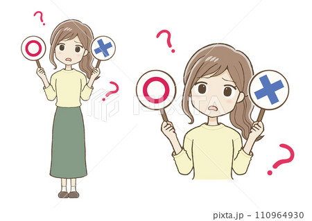 マルサインとバツサインを持って首をかしげるロングスカートの女性