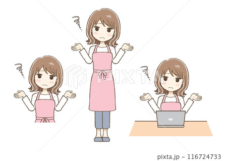 エプロンを着た女性が両手をあげて呆れ顔(全身、上半身、パソコン前)