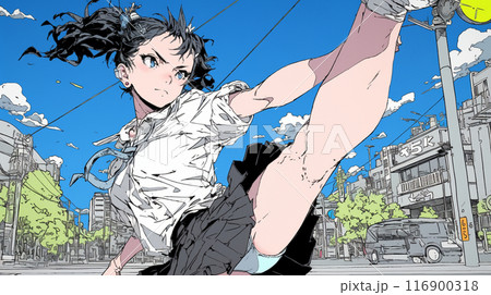 本気モードの喧嘩をしている女子高生:蹴り上げた勢いでパンチラ