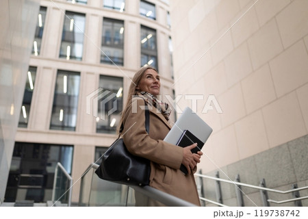 Businesswoman carrying a laptop and bag near a modern business center on a sunny day, showcasing