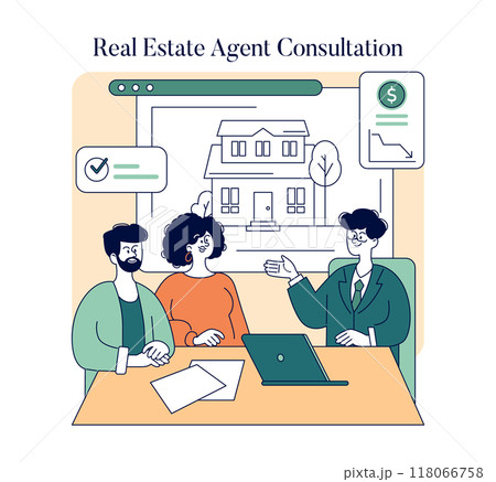 Real Estate Agent Consultation concept. A couple gets property investment advice from a professional in a modern office setting. Vector illustration.